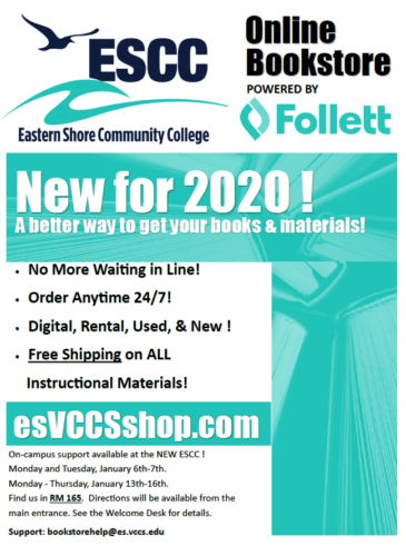 Eastern Shore Community College is now incorporating a new online bookstore experience for their students beginning with the Spring 2020 Semester that starts on January 13th in the new ESCC Academic Building.