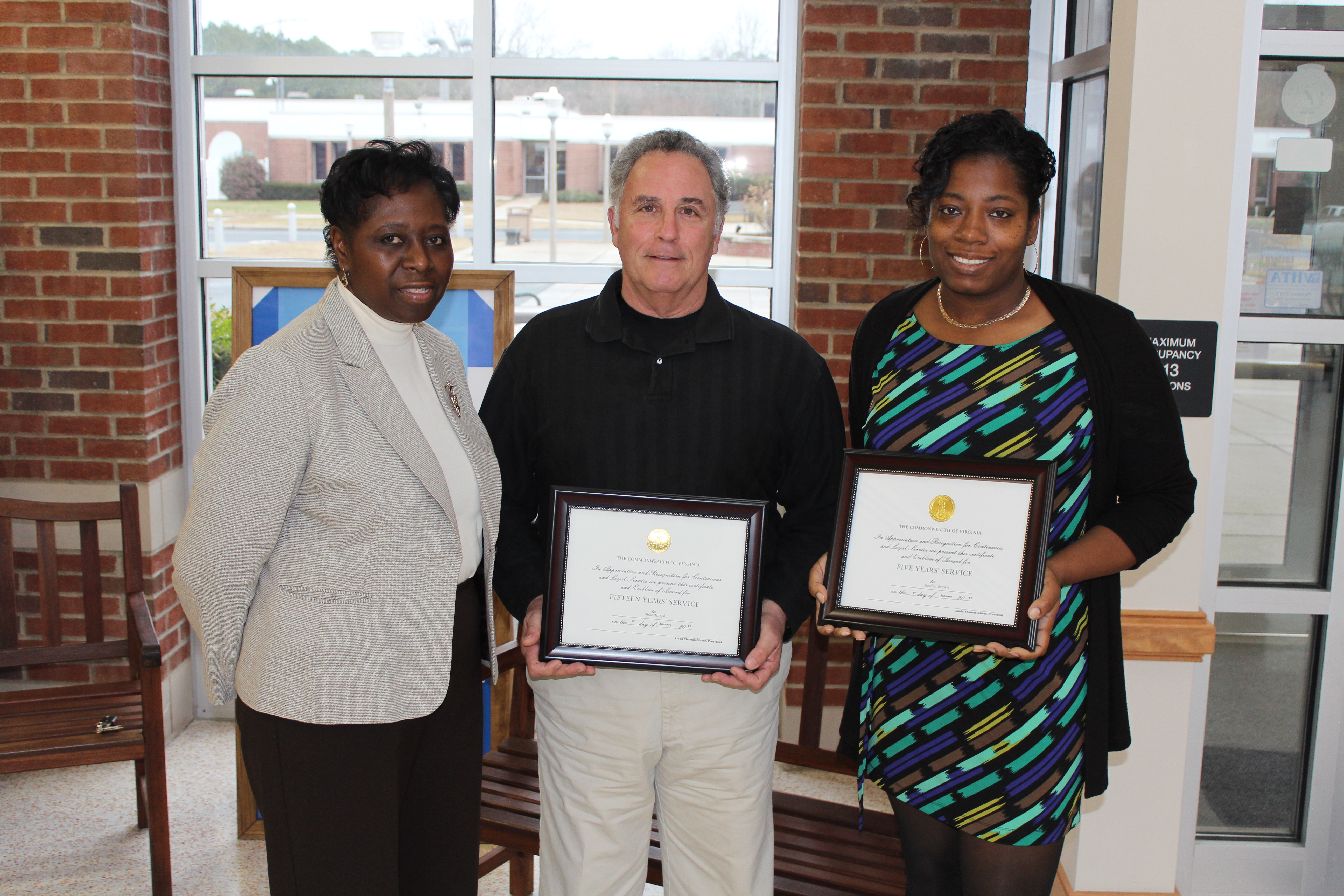 Eastern Shore Community College presented service awards to three staff and faculty members on Tuesday, January 3, during a special breakfast at the Workforce Development Services building.ESCC President Dr. Linda Thomas-Glover, oversaw the presentations acknowledging and celebrating years of service to the college and the Commonwealth of Virginia.
