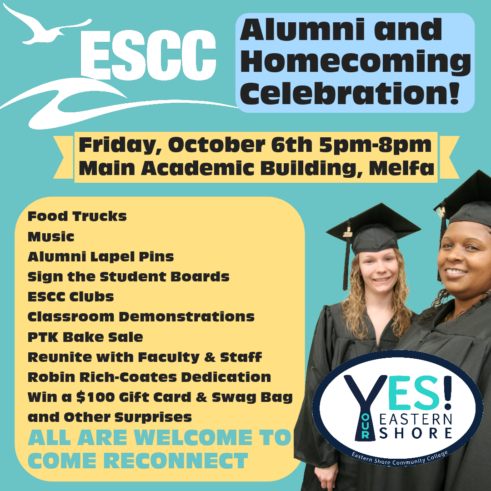 Alumni rooms will be stocked with boards to sign and lapel pins, and we’ll even have dedicated spaces for our many healthcare graduates plus alum from NASA Wallops Island and associated agencies. Welders! School teachers! Business owners! If you attended ESCC, please take a moment and come out Friday, October 6thand “RECONNECT WITH ESCC!”