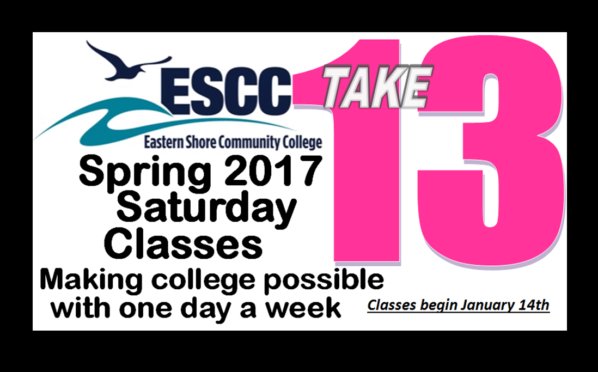 As Eastern Shore Community College begins its new Spring 2017 semester on January 9th, it will also continue the popular new offering of “TAKE 13” Saturday classes, beginning January 14th. Initially launched for the Fall 2016 semester, this initiative gained statewide attention and has been nominated for the New Horizon’s Excellence in Education Awards competition for 2017, acknowledging best-practice programs or initiatives that improve student success outcomes.